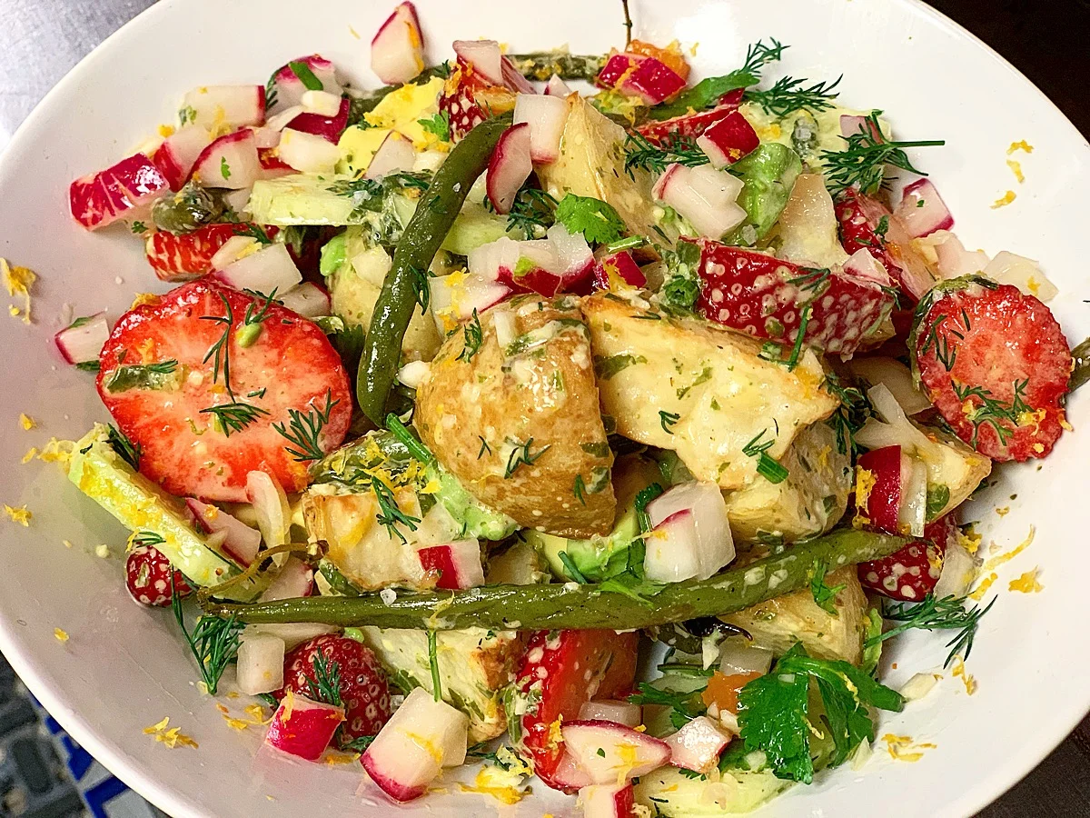 A bowl of fruit salad containing strawberries, radishes, avocado, green beans, potatoes, and garnished with herbs and lemon zest.